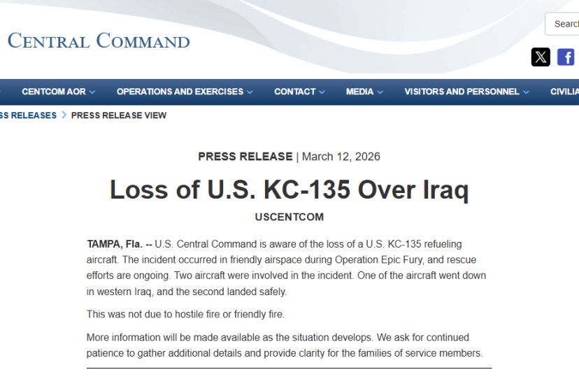 ABD Merkez Komutanlığı (CENTCOM), KC-135 tipi bir yakıt ikmal uçağının Irak’ta düştüğünü duyurdu. Kazanın Epic Fury Operasyonu (Destansı Öfke Operasyonu) sırasında dost hava sahasında meydana geldiği belirtilen açıklamada, kurtarma çalışmalarının devam ettiği ifade edildi. Kazaya 2 uçağın karıştığı belirtilerek, "Uçaklardan biri Irak’ın batısında düşmüş, diğeri ise güvenli bir şekilde iniş yapmıştır. Bu, kaza düşman ateşi veya dost ateşi nedeniyle yaşanmamıştır. Daha fazla detay ortaya çıktıkça kamuoyuna detaylı bilgi verilecektir" denildi.