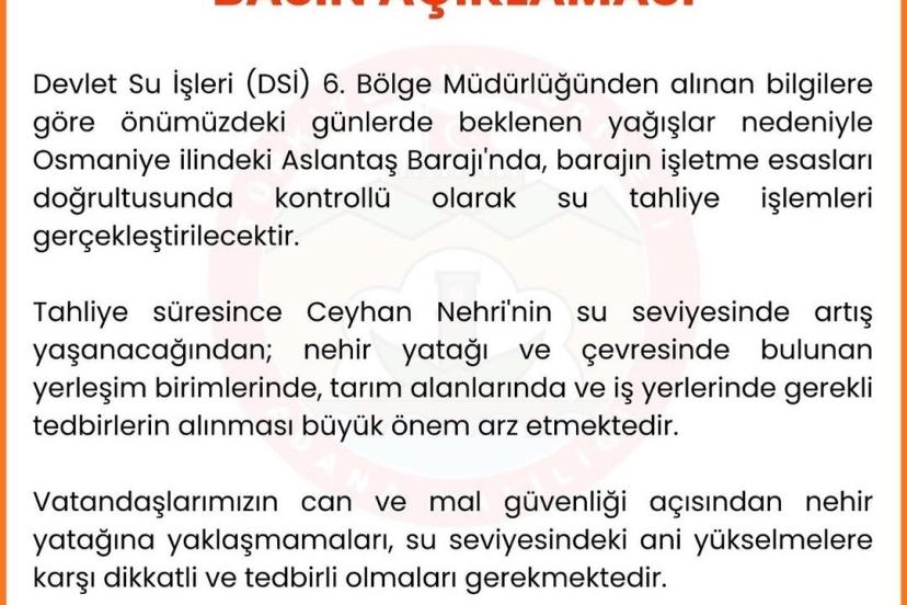 Adana Valiliği, Devlet Su İşleri (DSİ) 6. Bölge Müdürlüğü’nün önümüzdeki günlerde beklenen yağışlar nedeniyle Osmaniye’deki Aslantaş Barajı’nda kontrollü su tahliyesi yapacağını, Ceyhan Nehri’nde su taşkınları olabileceğini duyurdu.