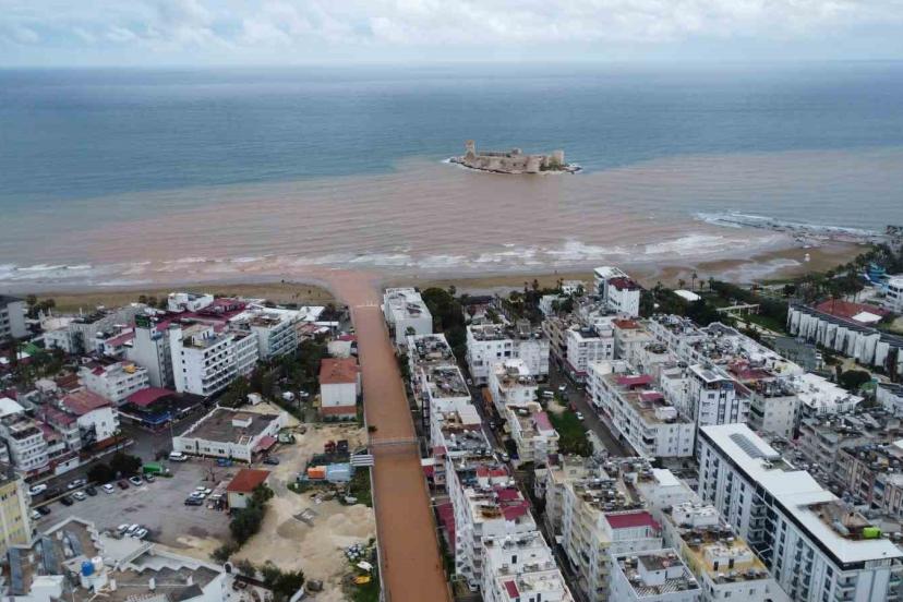 Mersin’de 3 gündür devam eden yağışlar etkisini sürdürürken derelere akan sel suları turizm merkezi Kızkalesi’ni hem çamura hem de kahverengiye bürüdü.