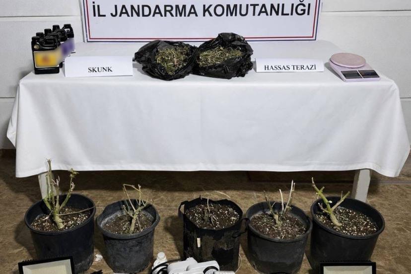 Antalya İl Jandarma Komutanlığı ekipleri, Antalya Cumhuriyet Başsavcılığı talimatları doğrultusunda uyuşturucuyla mücadele kapsamında Aksu ilçesinde çalışma yürüttü. Bu kapsamda T.D. isimli şüphelinin ikametinde ve serasında yapılan aramalarda, 243 gram skunk, 5 saksı içerisinde yetiştirilmiş skunk, 1 hassas terazi, 1 iklimlendirme çadırı, 2 LED ışıklandırma sistemi, 1 termometre, 2 folyo havalandırma hortumu ve 1 vantilatör ele geçirildi.