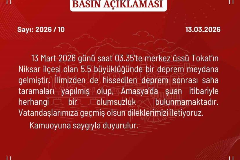 Açıklamada şu ifadelere yer verildi; "13 Mart 2026 günü saat 03.35’te merkez üssü Tokat’ın Niksar ilçesi olan 5.5 büyüklüğünde bir deprem meydana gelmiştir.