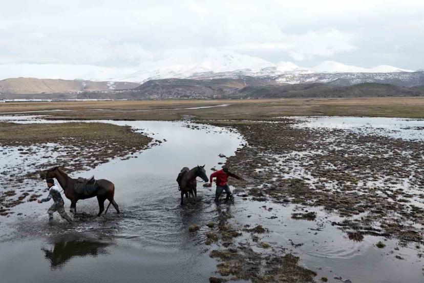 Suya düşen şahıslar ve atlar olayı yara almadan atlatırken, geçirilen eğlenceli anlar doğa fotoğrafçısı Emin Gürpınar’ın dron kamerasına yansıdı.