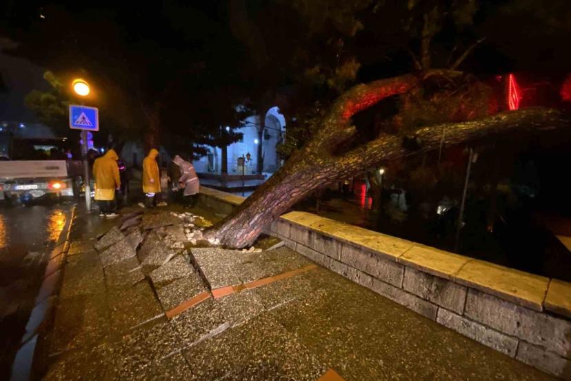Aydın’ın Efeler ilçesi kent merkezinde Bey Camii önündeki kaldırımda bulunan çam ağacı gün boyu etkili olan sağanak yağmur ne...