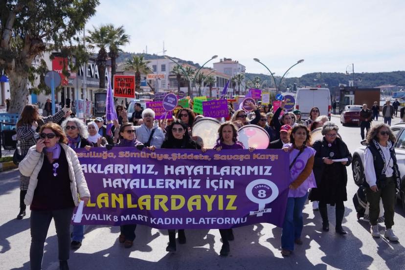 Balıkesir’in Ayvalık ilçesinde; kadınların emeğine, mücadelesine ve topluma kattığı değere dikkat çekmek amacıyla gerçekleştirilen yürüyüş, Öğretmenevi önünde başlayarak Cumhuriyet Meydanı’nda sona erdi.