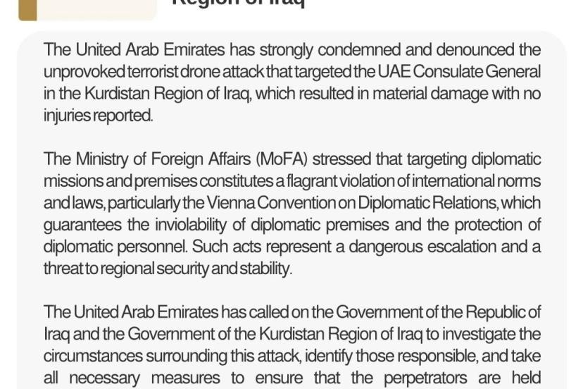 Birleşik Arap Emirlikleri (BAE) Dışişleri Bakanlığı, Kürt Bölgesel Yönetimi’ndeki BAE Başkonsolosluğu’na insansız hava aracı ...
