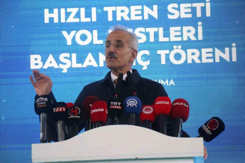Ulaştırma ve Altyapı Bakanı Abdulkadir Uraloğlu, Türkiye’nin 225 kilometre hıza sahip ilk milli elektrikli hızlı treninin raylara inişi ve yol testlerine başlama törenine katlıdı. Törende konuşan Uraloğlu, "Bugün Türkiye’nin 225 kilometre hıza sahip ilk milli elektrikli hızlı treninin raylara inişi ve yol testlerinin başlamasıyla tarihi bir ana tanıklık etmek üzere bir aradayız. Bu gurur verici adım, milletimizin azmi, mühendislerimizin emeği ve TÜRASAŞ’ın köklü birikimiyle vücut bulmuştur. Bu milli zaferi birlikte kutlamaktan büyük mutluluk duyuyorum" dedi.