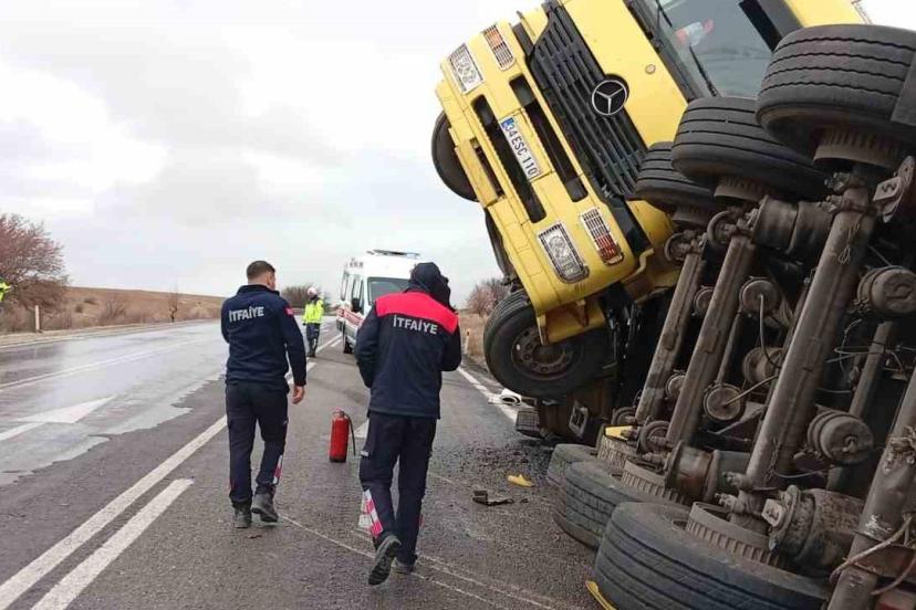 Afyonkarahisar’da yağışlı hava nedeniyle kontrolden çıkarak devrilen balık yemi yüklü tırın sürücüsü yaralandı.