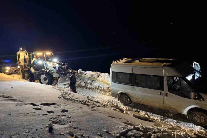 Van’ın Başkale ilçesinde kar yağışı ve tipinin etkisiyle yoldan çıkan minibüs kar birikintisine saplandı.
