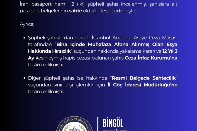 Edinilen bilgiye göre, Bingöl İl Emniyet Müdürlüğü ekipleri, göçmen kaçakçılığıyla mücadele kapsamında çalışma yaptı. Çalışmada, Muş-Elazığ istikameti üzerinde durdurulan otobüs içerisinde İran pasaport hamili 2 şahsın pasaport belgelerinin sahte olduğu tespit edildi. Ayrıca şüpheli şahıslardan birinin ‘Bina İçinde Muhafaza Altına Alınmış Olan Eşya Hakkında Hırsızlık’ suçundan hakkında yakalama kararı ve 12 yıl 3 ay kesinleşmiş hapis cezası bulunduğu öğrenildi.