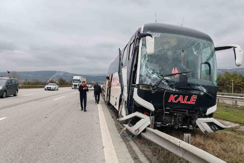 Anadolu Otoyolu’nun Bolu geçişinde tırla çarpışan yolcu otobüsü refüje savruldu. Kazada yaralanan olmazken, yolcu otobüsü büyük çapta hasar aldı.