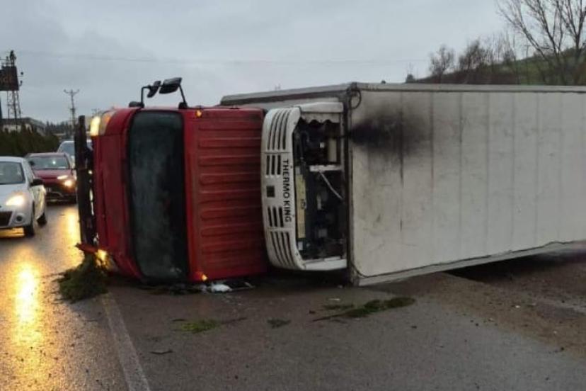 Kaza, Bursa-Ankara karayolu İnegöl girişinde meydana geldi. Edinilen bilgiye göre, Bursa’dan İnegöl istikametine seyir halinde olan Hasan Ş. (52) yönetimindeki 16 J 9995 plakalı kamyon, sürücüsünün direksiyon hakimiyetini kaybetmesi sonucu yol kenarında bulunan bir içecek fabrikasının duvarına çarptı. Çarpmanın etkisiyle kamyon devrildi.