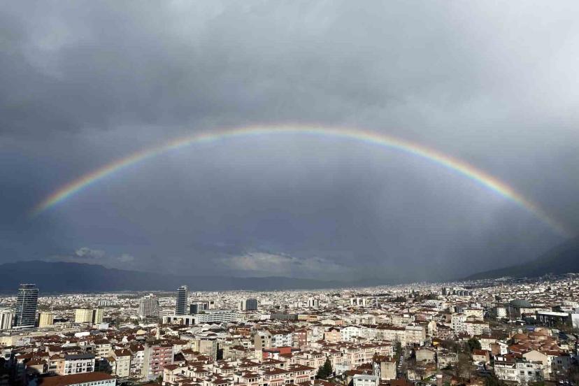 Bursa’da etkili olan yağışın ardından ortaya çıkan gökkuşağı görsel şölen oluşturdu.