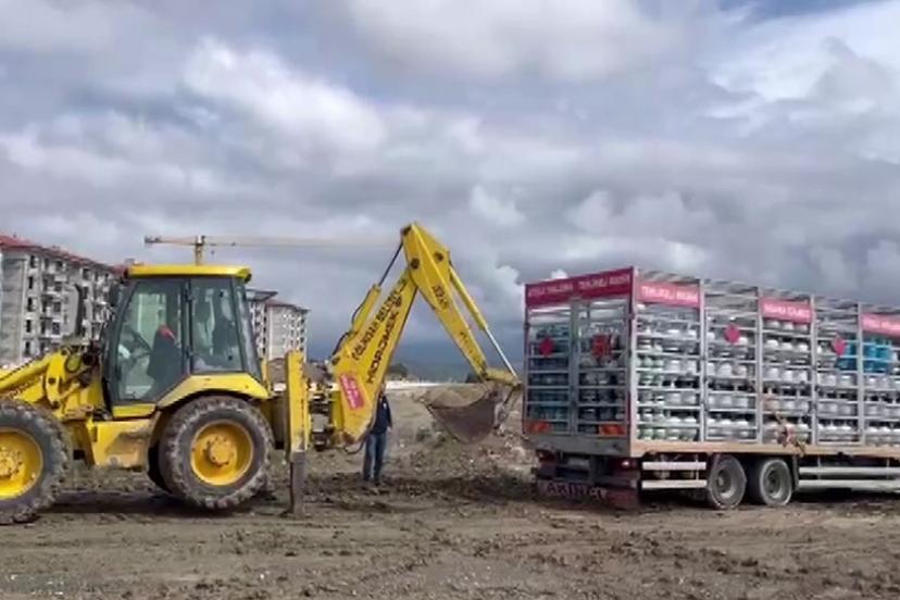 Çamura saplanan tüp yüklü kamyon kepçeyle kurtarıldı