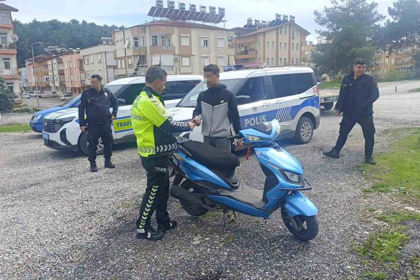 Milli Egemenlik Mahallesi’nde devriye görevi yapmakta olan Manavgat Emniyet Müdürlüğü Ekipler Amirliği’ne bağlı ekip, Kavaklı Mezarlığı önünde seyir halindeki motosikletin plakasının okunmayacak şekilde kapalı olduğunu görerek motosikleti durdurdu. Olay yerine çağrılan Trafik Denetleme Büro Amirliği’ne bağlı ekip tarafından yapılan kontrolde motosikleti kullanan Ali A.M.’nin sürücü belgesi olmadığı ve arkasından ceza yazılmaması için böyle bir yola başvurduğunu belirledi.