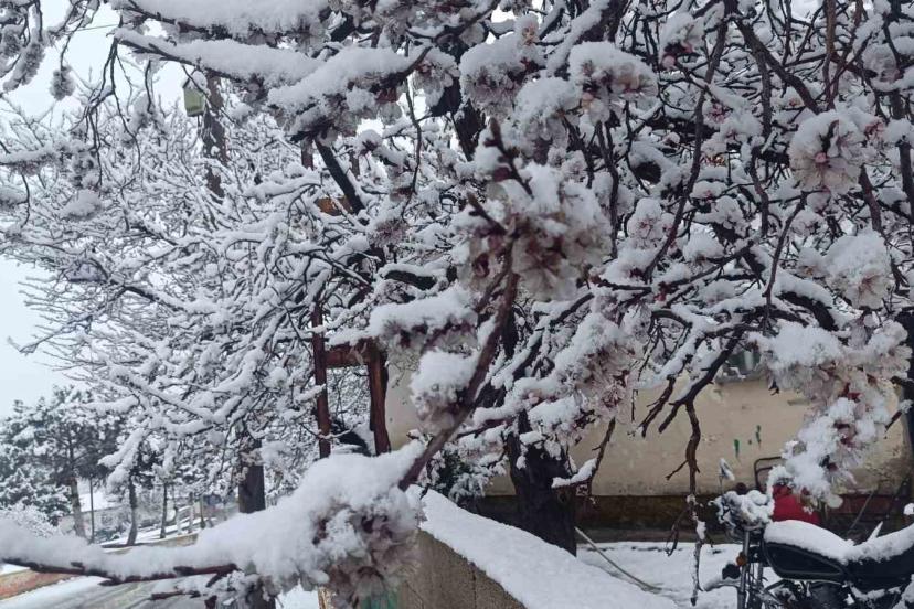 Çiçek açan ağaçlar yağan karla beyaza büründü