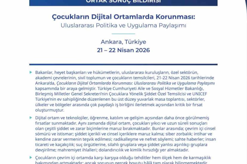 Aile ve Sosyal Hizmetler Bakanlığı ev sahipliğinde Birleşmiş Milletler Çocuk Fonu (UNICEF) ve Birleşmiş Milletler (BM) Genel Sekreteri Çocuklara Yönelik Şiddet Özel Temsilciliği iş birliğiyle ‘Çocukların Dijital Ortamlarda Korunmasına İlişkin Uluslararası Politika ve Uygulama Paylaşımı’ programı 21-22 Nisan’da gerçekleştirildi.