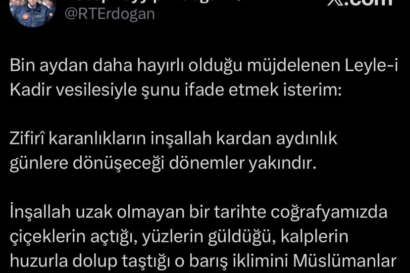 Cumhurbaşkanı Erdoğan, Kadir Gecesi dolayısıyla sosyal medya hesabından yaptığı paylaşımda, "Zifirî karanlıkların inşallah ka...