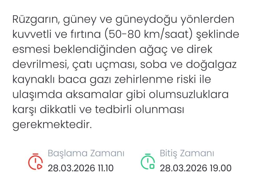 Meteoroloji Genel Müdürlüğü, Denizli’de rüzgarın güney ve güneydoğu yönlerden kuvvetli ve yer yer fırtına şeklinde (50-80 km/saat) esmesi beklendiğini açıkladı. Meteoroloji, beklenen olumsuz hava şartları nedeniyle ağaç ve direk devrilmesi, çatı uçması, soba ve doğalgaz kaynaklı baca gazı zehirlenmeleri ile ulaşımda aksamalar gibi risklere karşı vatandaşların dikkatli ve tedbirli olunması konusunda uyarıda bulundu. Uyarının 28 Mart 2026 saat 11.10’da başlayıp aynı gün saat 19.00’a kadar etkili olması bekleniyor.
