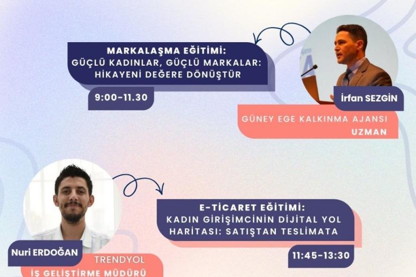 Günün ilk oturumu saat 09.00-11.30 arasında Güney Ege Kalkınma Ajansı Uzmanı İrfan Sezgin’in sunumuyla "Güçlü Kadınlar, Güçlü Markalar: Hikayeni Değere Dönüştür" başlıklı markalaşma eğitimi olacak. Ardından saat 11.45-13.30 arasında Trendyol İş Geliştirme Müdürü Nuri Erdoğan tarafından verilecek olan ve satıştan teslimata kadar tüm süreci kapsayan "Kadın Girişimcinin Dijital Yol Haritası: Satıştan Teslimata" konulu e-ticaret eğitimi gerçekleştirilecek.