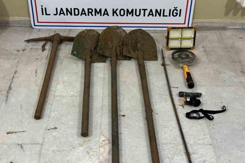 Aydın İl Jandarma Komutanlığı ve Efeler İlçe Jandarma Komutanlığınca yürütülen çalışmalar kapsamında, Kalfaköy Mahallesi’nde kaçak kazı yapıldığı tespit edildi. Bölgede gerçekleştirilen çalışma neticesinde V.A. (30), M.S. (56), M.Ş. (28), S.Y. (58) ve M.Y. (43) isimli şüpheliler kaçak kazı yaparken suçüstü yakalandı. Şüphelilerle birlikte 1 adet el dedektörü, 1 adet kazma, 3 adet kürek, 1 adet güneş paneli ve 3 adet el feneri ele geçirildi.