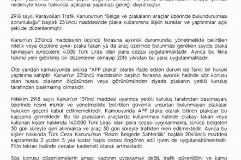 APP plaka olarak ifade edilen durumun farklı bir hukuki yaptırıma sahip olduğu belirtilen açıklamada, "Öte yandan kamuoyunda sıklıkla ‘APP plaka’ olarak ifade edilen durum ise farklı bir hukuki yaptırıma sahiptir. Kanun’un 23’üncü maddesinin beşinci fıkrasına aykırılık halinde söz konusu olan husus; plakanın ölçüsünden veya görünümünden ziyade plakanın yetkili kuruluş tarafından basılmamış olmasıdır. Nitekim 2918 sayılı Kanun’un 131’inci maddesi uyarınca yetkili kuruluş tarafından basılmayan, üzerinde resmi mühür ve yönetmelikte belirtilen güvenlik unsurları bulunmayan plakalar hukuken geçerli kabul edilmemektedir. Kamuoyunda APP plaka olarak bilinen plakalar bu kapsama girmektedir. Bu tür plakaların araçlarda kullanılması halinde plakayı takan veya kullanan kişiler hakkında 140 bin lira idari para cezası uygulanmakta, sürücü belgeleri 30 gün süreyle geri alınmakta ve araç 30 gün süreyle trafikten men edilmektedir. Ayrıca bu kişiler hakkında Türk Ceza Kanunu’nun ‘Resmi Belgede Sahtecilik’ başlıklı 204’üncü maddesi kapsamında 2 yıldan 5 yıla kadar hapis cezası öngören adli işlem de uygulanabilmektedir. Fiilin tekrarı halinde cezalar kademeli olarak artmaktadır" ifadelerine yer verildi.
