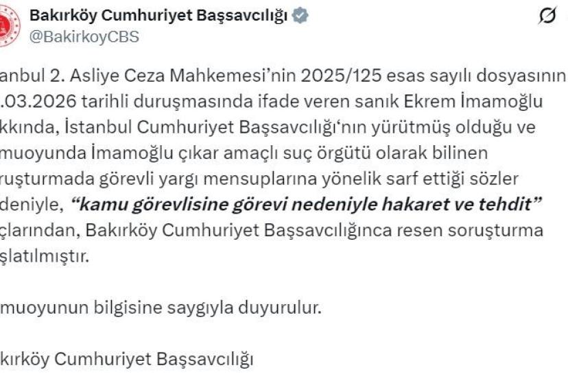 Bakırköy Cumhuriyet Başsavcılığı tarafından yapılan açıklamada, " İstanbul İstanbul 2. Asliye Ceza Mahkemesi’nin 2025/125 esas sayılı dosyasının 30.03.2026 tarihli duruşmasında ifade veren sanık Ekrem İmamoğlu hakkında, İstanbul Cumhuriyet Başsavcılığı‘nın yürütmüş olduğu ve kamuoyunda İmamoğlu çıkar amaçlı suç örgütü olarak bilinen soruşturmada görevli yargı mensuplarına yönelik sarf ettiği sözler nedeniyle , "kamu görevlisine görevi nedeniyle hakaret ve tehdit" suçlarından, Bakırköy Cumhuriyet Başsavcılığınca resen soruşturma başlatılmıştır.