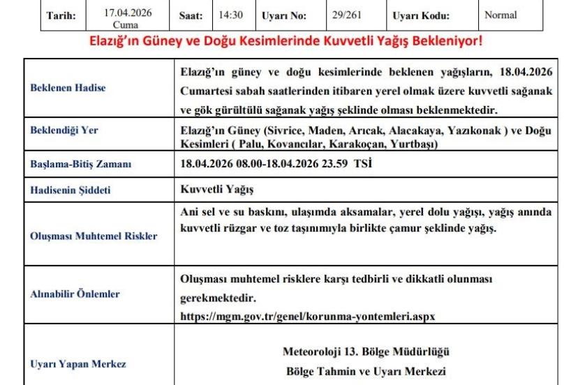 Meteoroloji 13. Bölge Müdürlüğü’nden yapılan açıklamada, "Elazığ’ın güney ve doğu kesimlerinde beklenen yağışların, 18.04.2026 Cumartesi sabah saatlerinden itibaren yerel olmak üzere kuvvetli sağanak ve gök gürültülü sağanak yağış şeklinde olması beklenmektedir. Beklendiği yer Elazığ’ın güney (Sivrice, Maden, Arıcak, Alacakaya, Yazıkonak ) ve doğu kesimleridir ( Palu, Kovancılar, Karakoçan, Yurtbaşı). Oluşması muhtemel riskler; ani sel ve su baskını, ulaşımda aksamalar, yerel dolu yağışı, yağış anında kuvvetli rüzgar ve toz taşınımıyla birlikte çamur şeklinde yağıştır. Oluşması muhtemel risklere karşı tedbirli ve dikkatli olunması gerekmektedir" denildi.