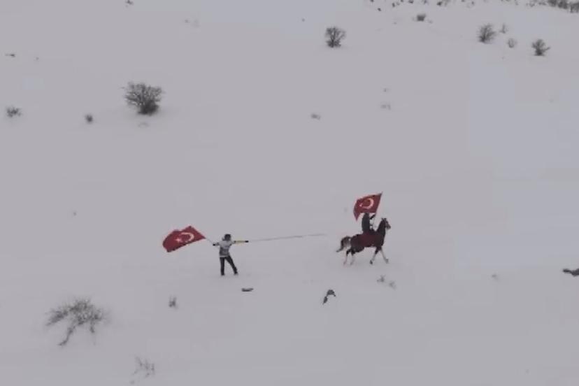 Kar kalınlığının yaklaşık 30 santimetreyi bulduğu arazide bir araya gelen sporcular, önce atlarla beyaz örtüyle kaplanan ovada gezinti yaptı. Daha sonra yanlarında getirdikleri snowboardlarla atların arkasına bağlanan ipleri tutan gençler, ellerinde Türk bayraklarıyla snowboard yaptı.
