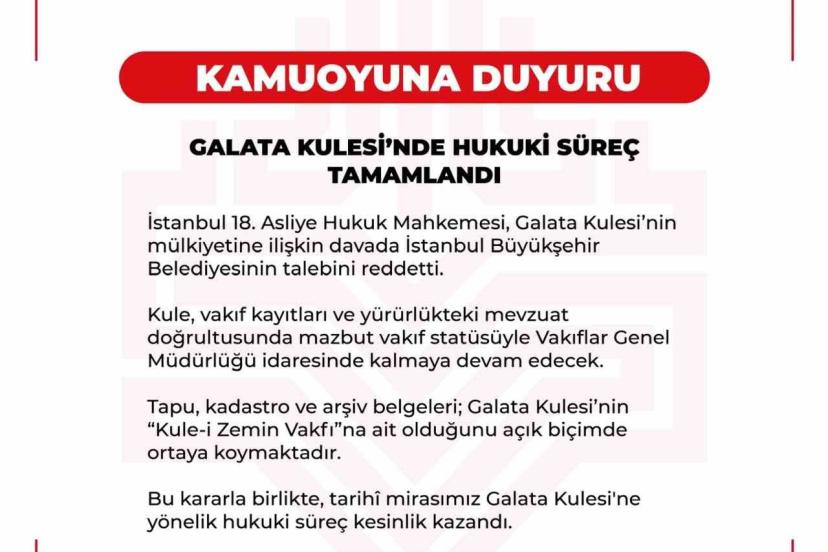 Vakıflar Genel Müdürlüğü’nden yapılan açıklamada, "İstanbul 18. Asliye Hukuk Mahkemesi, Galata Kulesi’nin mülkiyetine ilişkin davada İstanbul Büyükşehir Belediyesinin talebini reddetti. Kule, vakıf kayıtları ve yürürlükteki mevzuat doğrultusunda mazbut vakıf statüsüyle Vakıflar Genel Müdürlüğü idaresinde kalmaya devam edecek. Tapu, kadastro ve arşiv belgeleri; Galata Kulesi’nin "Kule-i Zemin Vakfı’na ait olduğunu açık biçimde ortaya koymaktadır. Bu kararla birlikte, tarihi mirasımız Galata Kulesi’ne yönelik hukuki süreç kesinlik kazandı" denildi.