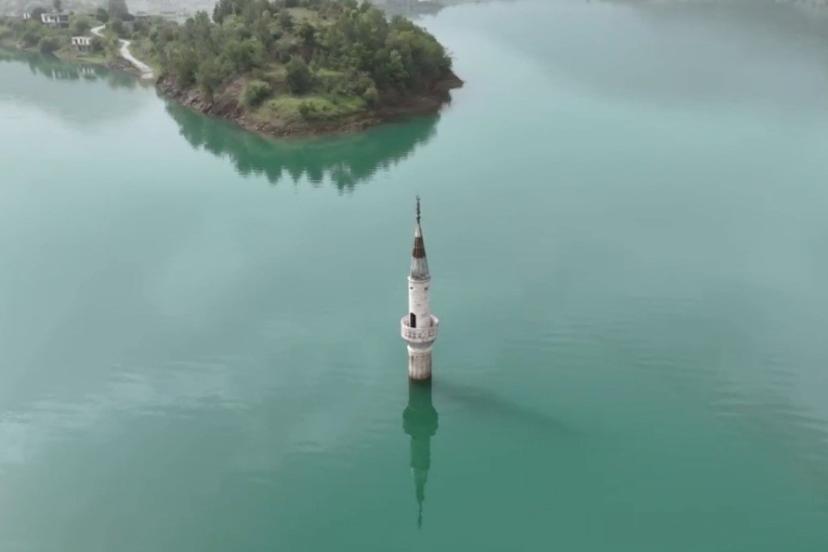 Öte yandan, baraj gölü üzerinde yalnız başına yükselen minare, su yüzeyindeki yansımasıyla dikkat çekiyor. Dron ile kaydedilen görüntüler, hem doğadaki değişimi hem de sular altında kalan bir yerleşimin izlerini gözler önüne sererken, ortaya çıkan manzara geçmiş ile bugünün aynı karede buluştuğu etkileyici bir görüntü sunuyor.