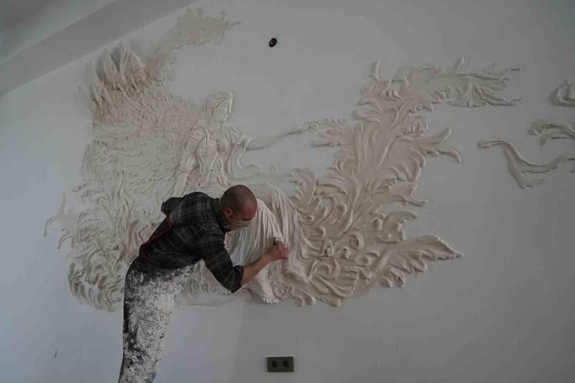 Genç sanatçı alçıyla duvarları resim tablosuna dönüştürüyor