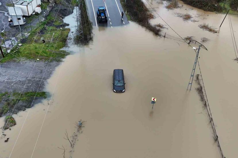Göle dönen yolda mahsur kalan sürücü aracını bırakmadı, kurtarma anları görüntülendi