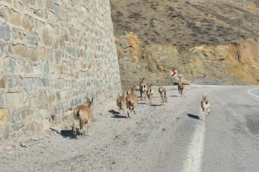 Bahçeli beldesinde kaydedilen görüntülerde sürü halinde yol üzerinde ilerleyen yaban keçileri, kendilerine yaklaşan aracı fark edince hızla kaçmaya başladı. Kısa sürede yoldan çıkarak dağa doğru yönelen keçiler, yavrularıyla birlikte sarp kayalıklara tırmanarak gözden kayboldu.