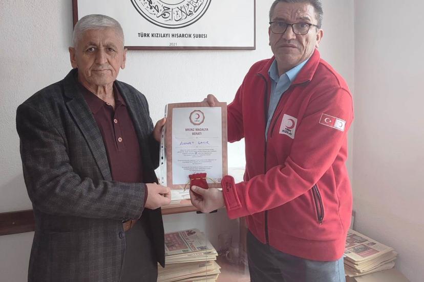 Kütahya’nın Hisarcık ilçesinde Kızılay’a düzenli olarak kan bağışında bulunan esnaf Ahmet Çayır, 18. bağışını tamamlaması dolayısıyla bronz madalya ve berat aldı.