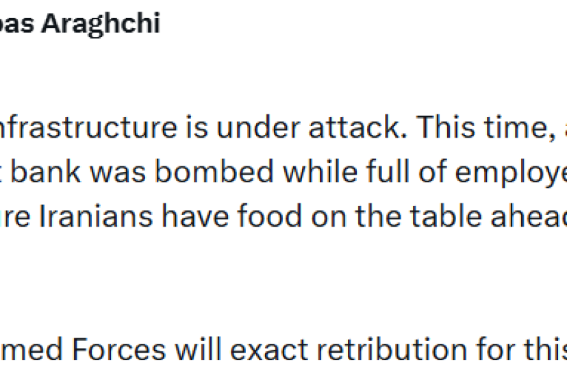 İran Dışişleri Bakanı Abbas Arakçi, bir banka şubesinin çalışanlarla doluyken bombalandığını duyurarak, "Güçlü silahlı kuvvetlerimiz bu suça gerektiği şekilde karşılık verecektir" dedi.