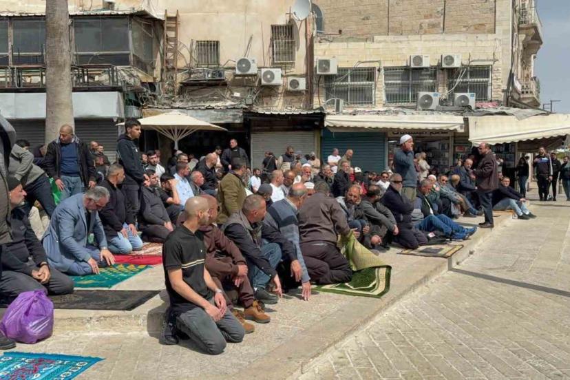 İsrail’in İran saldırılarının ardından toplanma yasağı kararıyla Mescid-i Aksa’yı kapalı tutması nedeniyle binlerce kişi cuma namazını Mescid-i Aksa’nın kapılarının yakının da ya da Eski Şehir bölgesinde kıldı.