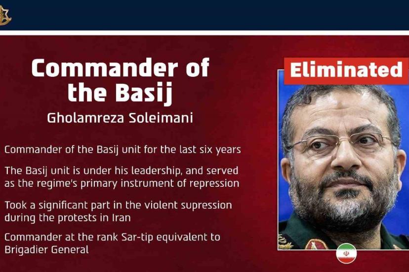 İsrail ordusu, İran Devrim Muhafızları Ordusu Besic Güçleri Komutanı Gulam Reza Süleymani’nin dün Tahran’a düzenlenen saldırıda öldürüldüğünü iddia etti.