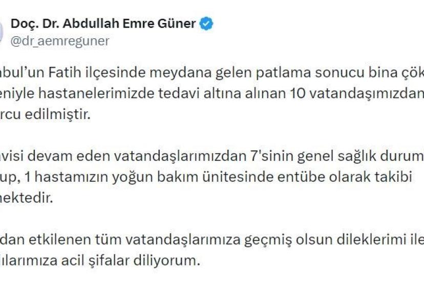 İstanbul İl Sağlık Müdürü Doç. Dr. Abdullah Emre Güner, Fatih’te çöken binada yaralananların durumu ile ilgili açıklama yaptı. Güner açıklamada, "İstanbul’un Fatih ilçesinde meydana gelen patlama sonucu bina çökmesi nedeniyle hastanelerimizde tedavi altına alınan 10 vatandaşımızdan 2’si taburcu edilmiştir. Tedavisi devam eden vatandaşlarımızdan 7’sinin genel sağlık durumları iyi olup, 1 hastamızın yoğun bakım ünitesinde entübe olarak takibi sürmektedir. Olaydan etkilenen tüm vatandaşlarımıza geçmiş olsun dileklerimi iletiyor, yaralılarımıza acil şifalar diliyorum" ifadelerini kullandı.