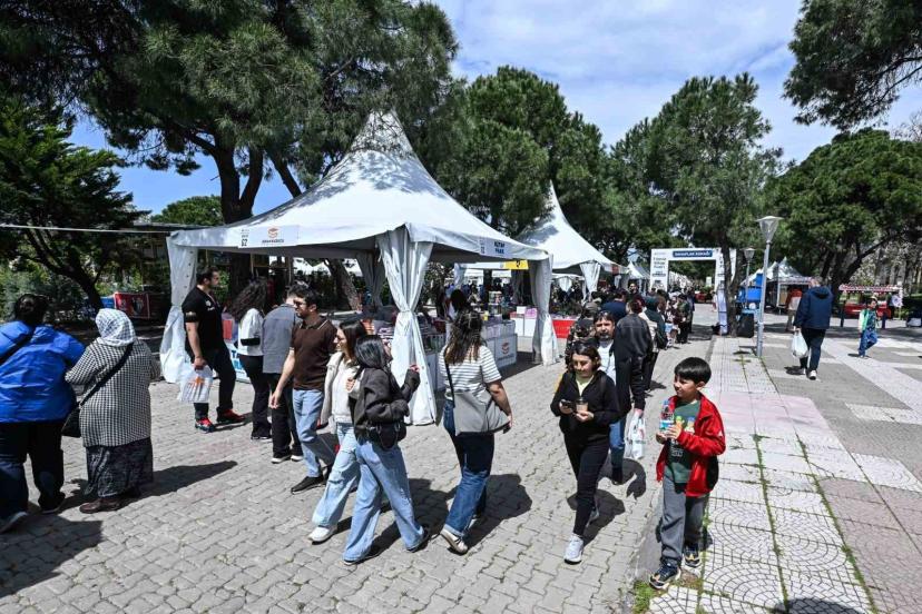 İzmir Büyükşehir Belediyesi’nin ev sahipliğinde, İZFAŞ ve TACT Fuarcılık iş birliğiyle 17-26 Nisan tarihleri arasında Kültürpark’ta düzenlenen İZKİTAP - 7. İzmir Kitap Fuarı, yayınevleri, sahaflar, eğitim ve kültür kurumları ile sivil toplum kuruluşlarını bir araya getirirken; yaklaşık 200 katılımcı ve 400’e yakın yazar, şair, gazeteci ve akademisyeni okurlarla buluşturuyor. Fuar kapsamında söyleşi ve imzalarla birlikte toplamda 500’e yakın etkinlik düzenleniyor. Fuarın ikinci gününde, hafta sonu güzel havayı da fırsat bilen kitapseverler, Kültürpark’ı doldurdu. Öğrenciler, çocuklarıyla birlikte fuara gelen aileler, her yaştan İzmirli, edebiyatla dolu bir gün yaşadı. Özellikle söyleşi alanları ve imza stantlarında kuyruklar oluştu. Okurlar hem sevdikleri yazarlarla bir araya gelme hem de yeni yayımlanan kitapları keşfetme fırsatı buldu.