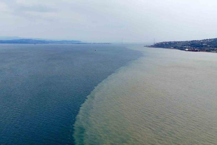 İzmit Körfezi iki renk oldu: Derenin taşıdığı çamur denizin rengini değiştirdi