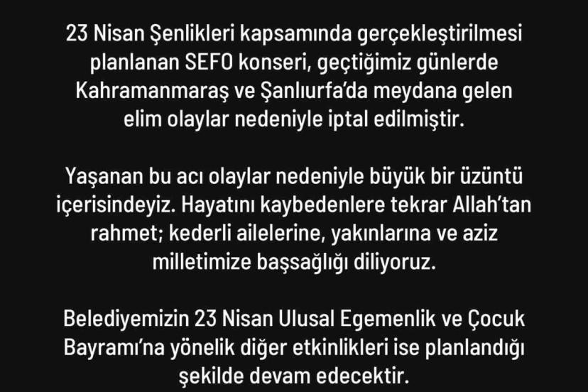 Denizli Büyükşehir Belediyesi, 23 Nisan Ulusal Egemenlik ve Çocuk Bayramı etkinlikleri kapsamında gerçekleştirilmesi planlanan Sefo konserinin iptal edildiğini duyurdu.