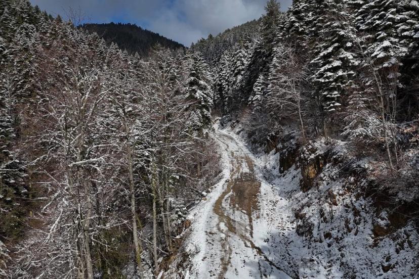 Karabük-Bartın kara yolunda etkili olan kar yağışı sonrası oluşan beyaz örtü dronla görüntülendi.