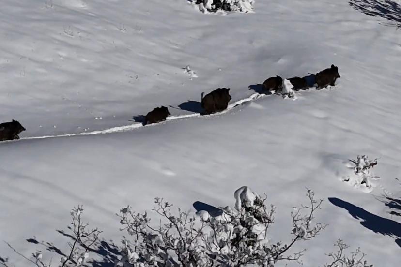 Karlı arazide ilerleyen domuz sürüsü havadan görüntülendi