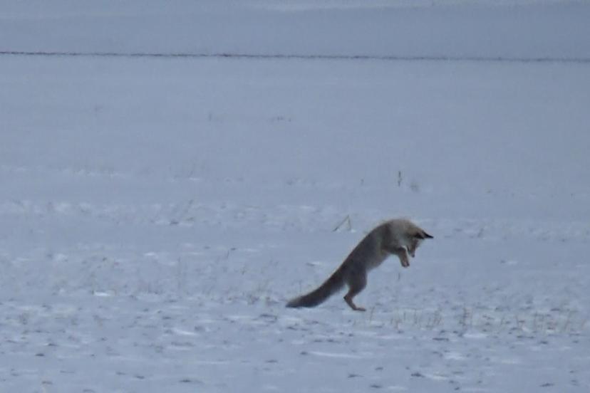 Bir süre sessizce bekleyen tilki, kar altındaki hareketin netleşmesi üzerine aniden havaya sıçradı. Başını kara gömerek yaptığı hamleyle avını yakalayan tilki, avını ağzına alarak bölgeden uzaklaştı.