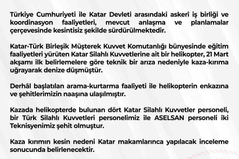"Katar-Türk Birleşik Müşterek Kuvvet Komutanlığı bünyesinde eğitim faaliyetleri yürüten Katar Silahlı Kuvvetlerine ait bir helikopter, 21 Mart akşamı ilk belirlemelere göre teknik bir arıza nedeniyle kaza-kırıma uğrayarak denize düşmüştür. Derhal başlatılan arama-kurtarma faaliyeti ile helikopterin enkazına ve şehitlerimizin naaşına ulaşılmıştır. Kazada helikopterde bulunan dört Katar Silahlı Kuvvetler personeli, bir Türk Silahlı Kuvvetleri personelimiz ile ASELSAN personeli iki teknisyenimiz şehit olmuştur. Kaza kırımın kesin nedeni Katar makamlarınca yapılacak inceleme sonucunda belirlenecektir. Bu elim kazada hayatını kaybeden tüm şehitlerimize Allah’tan rahmet, ailelerine sabır, Türk Silahlı Kuvvetlerimize, Katar Silahlı Kuvvetlerine, ASELSAN’a, Türk milleti ile kardeş Katar halkına başsağlığı dileriz."