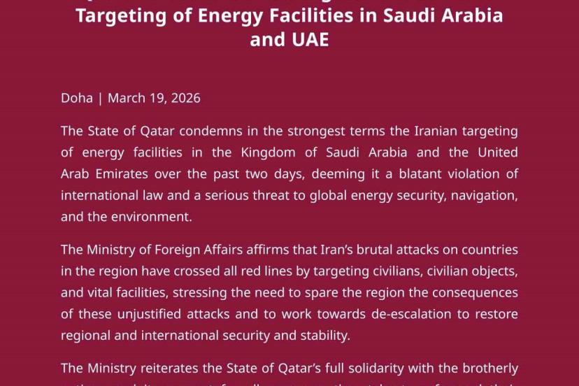 Katar Dışişleri Bakanlığı, İran’ın Suudi Arabistan ve Birleşik Arap Emirlikleri’ndeki (BAE) enerji tesislerine yönelik saldırılarının şiddetle kınandığını vurgulayarak, "İran’ın bölgedeki ülkelere yönelik acımasız saldırıları sivilleri, sivil altyapıları ve hayati tesisleri hedef alarak tüm kırmızı çizgileri aşmıştır" açıklamasında bulundu.