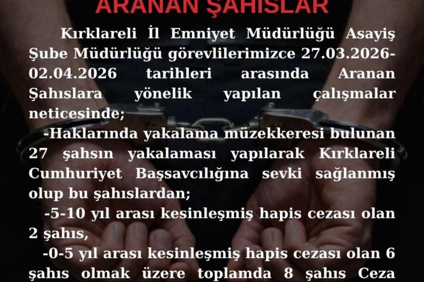 Kırklareli İl Emniyet Müdürlüğü Asayiş Şube Müdürlüğü ekiplerince aranan şahıslara yönelik düzenlenen operasyonlarda 8 kişi y...