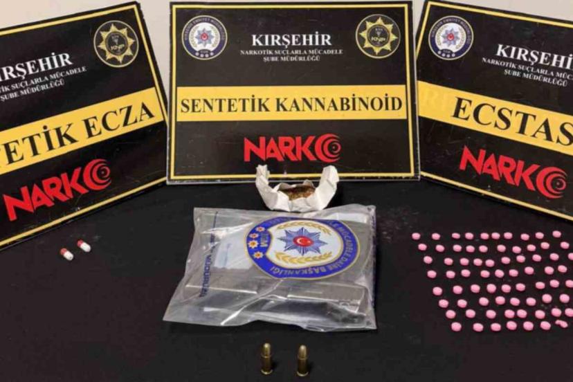 Edinilen bilgiye göre, Kırşehir İl Emniyet Müdürlüğü Narkotik Suçlarla Mücadele, KOM ve Asayiş Şube Müdürlükleri ile Boztepe İlçe Emniyet Amirliği ekiplerince yürütülen çalışmalar kapsamında "Kasten Yaralama, Tehdit ve Hakaret" olayı şüphelisi yakalandı. Şüpheliye ait araç ve şüphelinin ikamette yapılan aramalarda 82 hap, 10,05 gram sentetik madde, 2 hap, 1 ruhsatsız tabanca, 1 şarjör ve 2 fişek ele geçirildi.