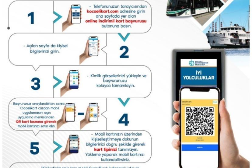 "İnternet tarayıcısı üzerinden kocaelikart.com adresine giriş yapılır. Ana sayfadaki online indirimli kart başvurusu" seçeneğine tıklanarak istenen kişisel bilgiler doldurulur ve kimlik belgelerine ait görseller sisteme yüklenir. Başvurunun onaylanmasının ardından telefonlara indirilen "Kocaeli Kart Cüzdan" mobil uygulaması açılır. Menüden "QR Kart" bölümüne girilerek mobil kart satın alma işlemi gerçekleştirilir. Aynı ekran üzerinden "Kişiselleştirme" adımına geçilerek kart türü seçilir ve işlem tamamlanır. Tam kart almak isteyenler ise web sitesi başvurusu yapmadan, doğrudan mobil uygulama üzerinden "QR Kart" oluşturarak sistemi anında kullanmaya başlayabilir."