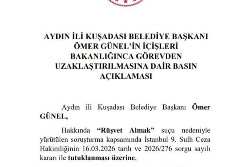 İçişleri Bakanlığı tarafından yapılan açıklamada, Aydın’ın Kuşadası ilçesinin Belediye Başkanı Ömer Günel’in görevden uzaklaştırıldığı duyuruldu. Açıklamada, "Aydın ili Kuşadası Belediye Başkanı Ömer Günel hakkında ‘Rüşvet Almak’ suçu nedeniyle yürütülen soruşturma kapsamında İstanbul 9.Sulh Ceza Hakimliğinin 16.03.2026 tarih ve 2026/276 sorgu sayılı kararı ile tutuklanması üzerine, Anayasanın 127’nci maddesi ile 5393 sayılı Belediye Kanununun 47’nci maddesi uyarınca geçici bir tedbir olarak İçişleri Bakanlığı’nca görevden uzaklaştırılmıştır. Kamuoyuna saygıyla duyurulur" ifadeleri kullanıldı.
